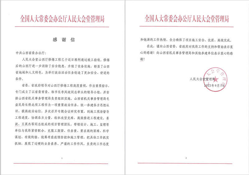 修繕后的山西廳進(jìn)一步消除了安全隱患,升級(jí)了設(shè)備設(shè)施,彰顯了山西省地域和人文特色,為舉行政治活動(dòng)任務(wù)創(chuàng)造了更加安全、舒適的條件。為此人民大會(huì)堂管理局特此向山西省機(jī)關(guān)事務(wù)管理局及其他參建單位表示衷心的感謝。