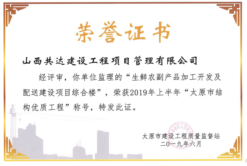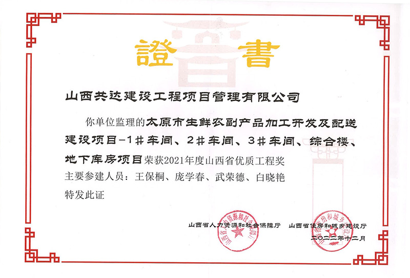 近日,由我公司參建的太原市生鮮農(nóng)副產(chǎn)品加工開發(fā)及配送建設項目取得“太原市結構優(yōu)質(zhì)工程”稱號之后又再次榮獲“山西省優(yōu)質(zhì)工程獎”。