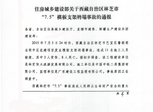住房城鄉(xiāng)建設(shè)部關(guān)于西藏自治區(qū)林芝市“7.5”模板支架坍塌事故的通報(bào)
