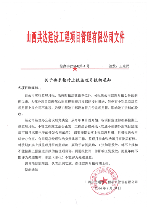關于要求按時上報監(jiān)理月報的通知