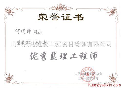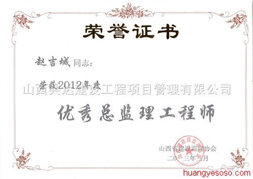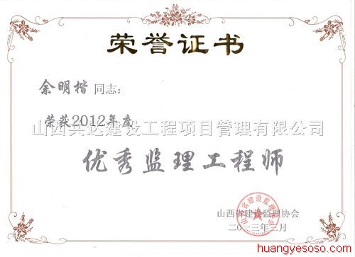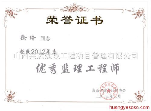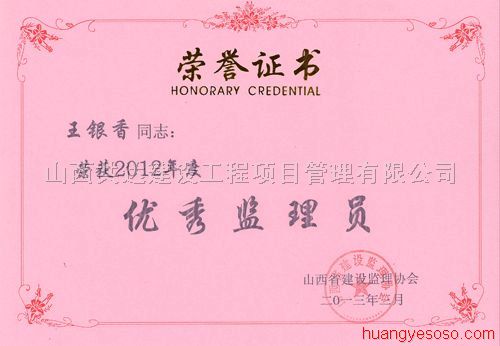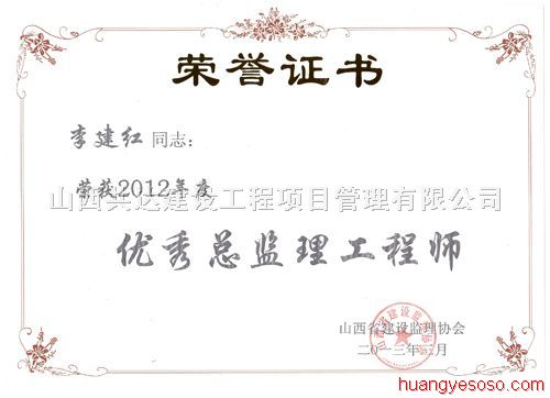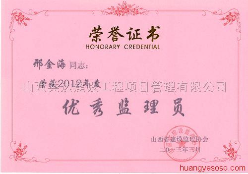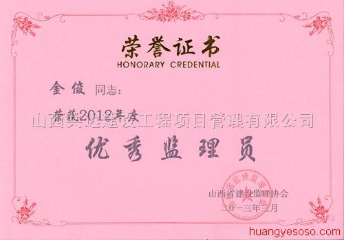 我公司被山西省建設(shè)監(jiān)理協(xié)會評為“2012年度工程監(jiān)理先進企業(yè)”,趙吉城、李建紅被評為“2012年度山西省優(yōu)秀總監(jiān)理工程師”,余明楷、何連仲、徐玲被評為“2012年度山西省優(yōu)秀監(jiān)理工程師”,邢金海、王銀香、金俊被評為“2012年度山西省優(yōu)秀監(jiān)理員”。
