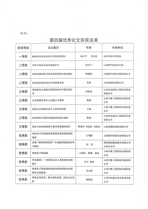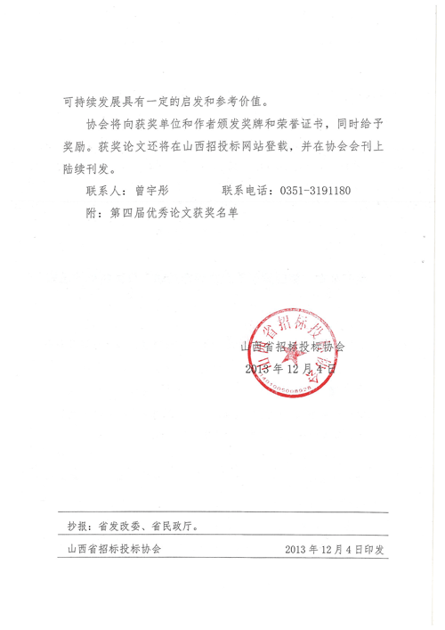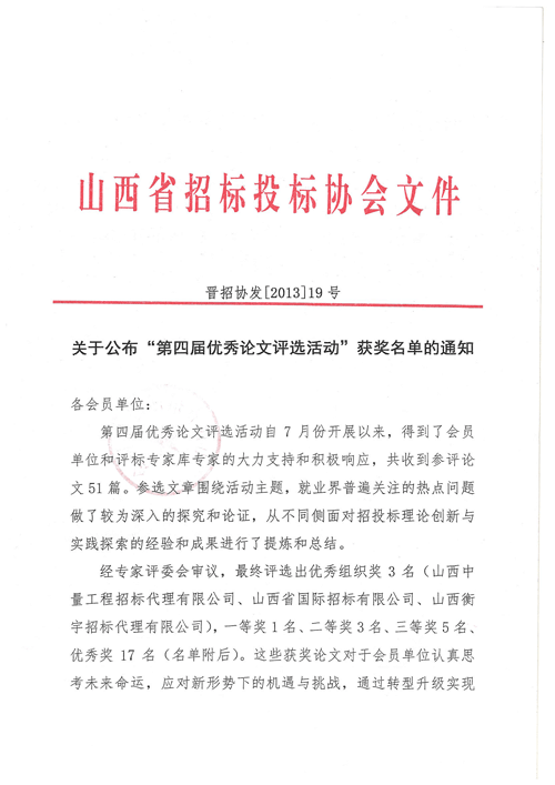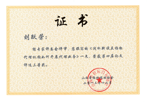 我公司工程監(jiān)理部劉躍榮同志撰寫的《淺析新設立招標代理機構如何開展代理業(yè)務》一文,被山西省招標投標協(xié)會評為“第四屆論文三等獎”。