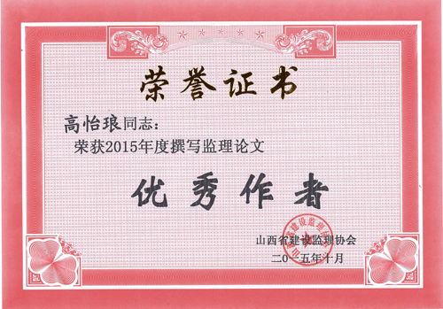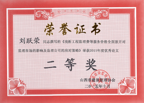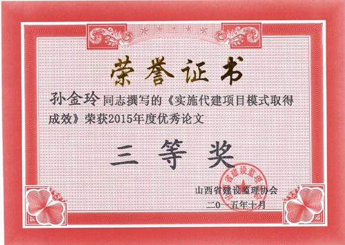 我公司分別榮獲了“2015年度企業(yè)優(yōu)秀內(nèi)刊(簡報)銀頁獎” 、“2015年度監(jiān)理企業(yè)優(yōu)秀網(wǎng)站獎”; 公司副總經(jīng)理劉躍榮撰寫的《淺析工程監(jiān)理費等服務價格全面放開對監(jiān)理市場的影響及監(jiān)理公司的應對策略》獲得了“2015年度優(yōu)秀論文二等獎”,項目監(jiān)理部總監(jiān)理工程師孫金玲撰寫的《實施代建項目模式取得成效》獲得了“2015年度優(yōu)秀論文三等獎”;綜合辦公室高怡瑯獲得了“2015年度撰寫監(jiān)理論文優(yōu)秀作者”,金俊獲得了“2015年度優(yōu)秀通聯(lián)員”。公司綜合辦金俊參加了本次會議。