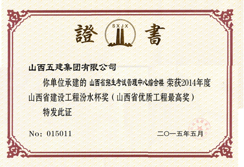 由山西五建集團(tuán)有限公司承建,我公司監(jiān)理的山西省招生考試管理中心綜合樓榮獲“2014年度山西省建設(shè)工程汾水杯獎(jiǎng)”,此獎(jiǎng)為山西省優(yōu)質(zhì)工程最高獎(jiǎng)。