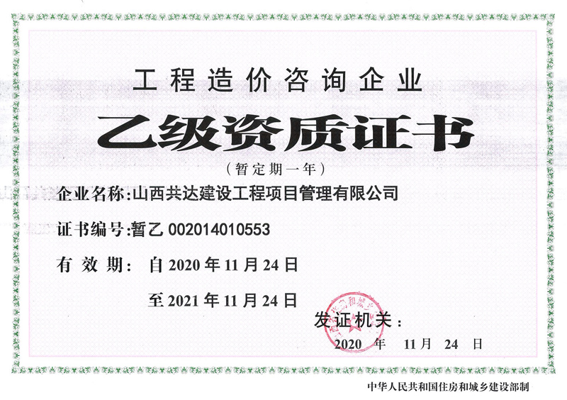 · 工程造價(jià)咨詢企業(yè)乙級(jí)資質(zhì)證書